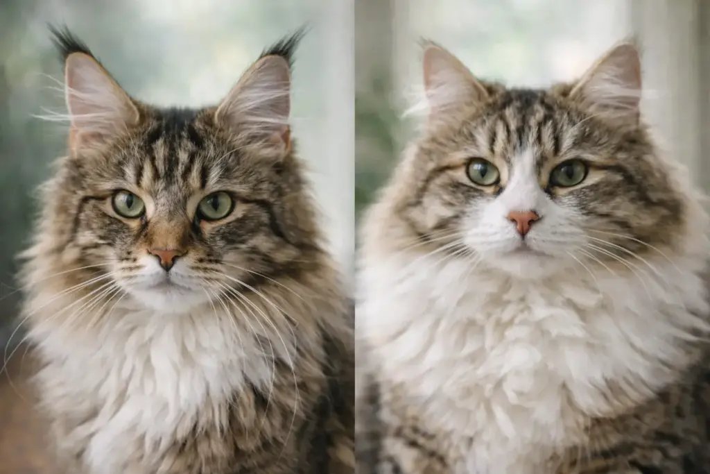 メインクーンはマズル(口元)が四角く見えたり、顔が縦長寄りに見えたりすることが多いです。サイベリアンは同じ大型でも「丸み」や「やわらかさ」が出やすいので、見比べると違いが分かりやすいです。